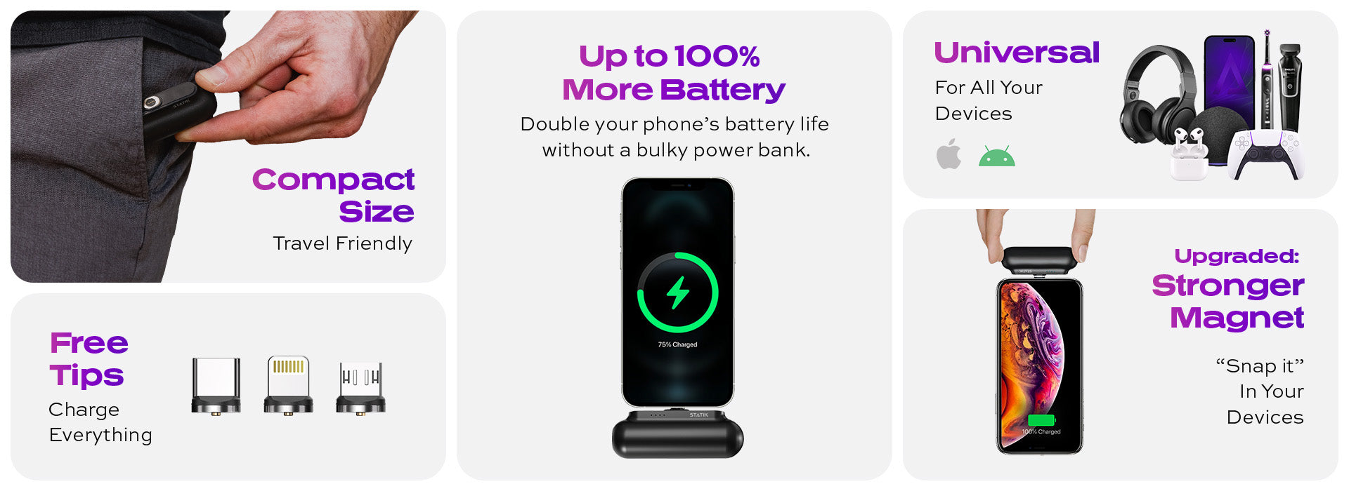 - No cords. Snap it, charge it: magnetic tips to easily connect and disconnect from any of your handheld devices and accessories, while keeping your charging ports protected from dust & dirt.
