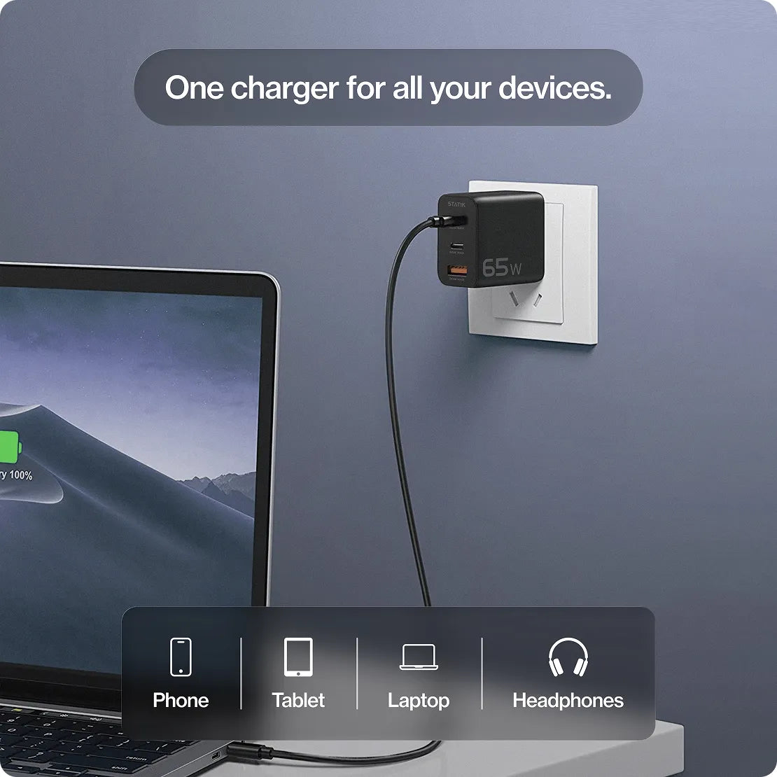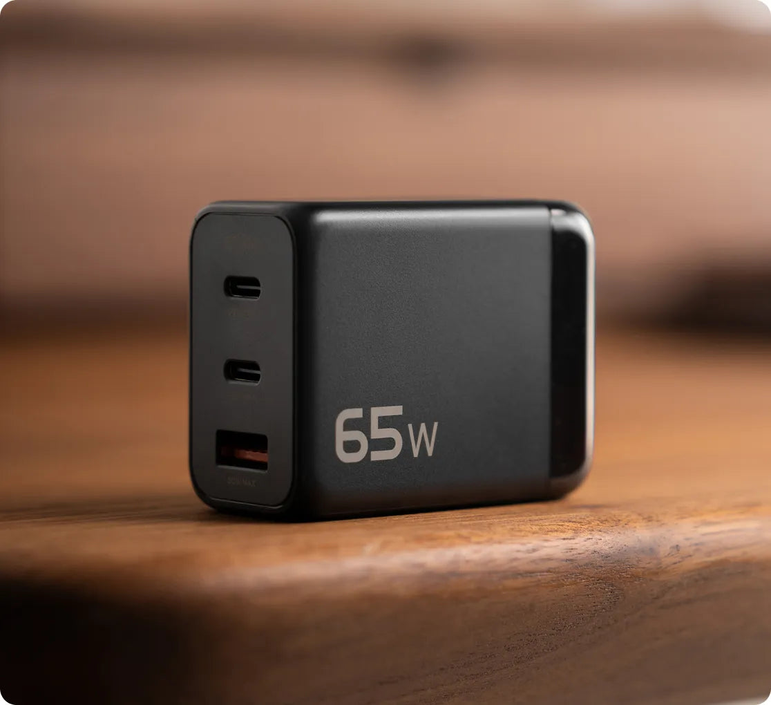 The 65W GaN Charger is built to replace multiple adapters. With two USB-C ports and one USB-A, you can power a laptop, phone, and earbuds at the same time without slowing down. One adapter, three devices, endless convenience.