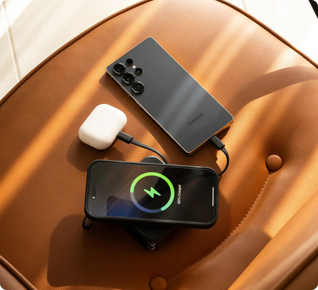 SmartCharge comes with USB-C and Lightning cables built right in. So you can charge your phone, tablet, earbuds, or even your laptop without digging for cords. Wherever you travel, your charging setup is already packed.