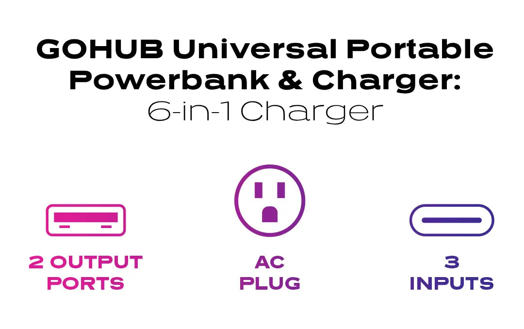 - 6-in-1 Powerbank and Charger. GoHub™ is the perfect way to charge up devices – at home and on the go. Simply plug it into the wall to use it as a charger, or unplug it to use it as a powerbank when you travel.