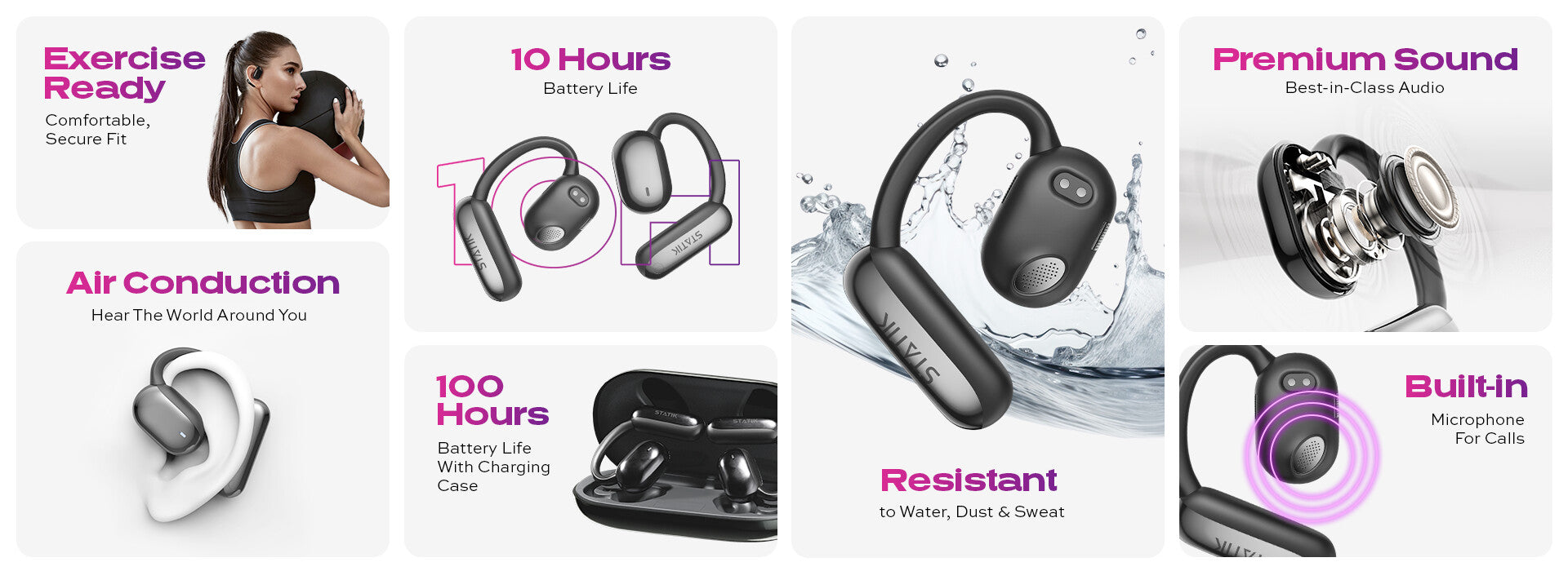 - Bluetooth Earbuds with Open-Ear Design. High quality audio transmitted through the ear bone, without clogging your ear canal.