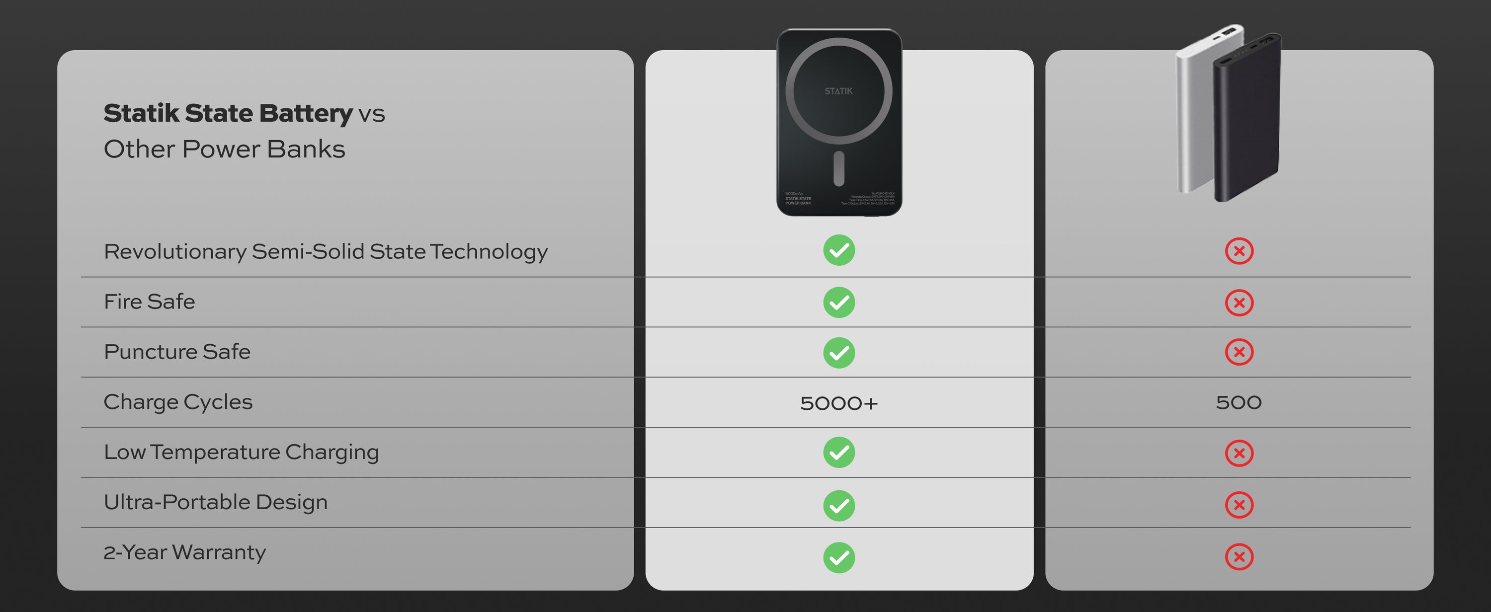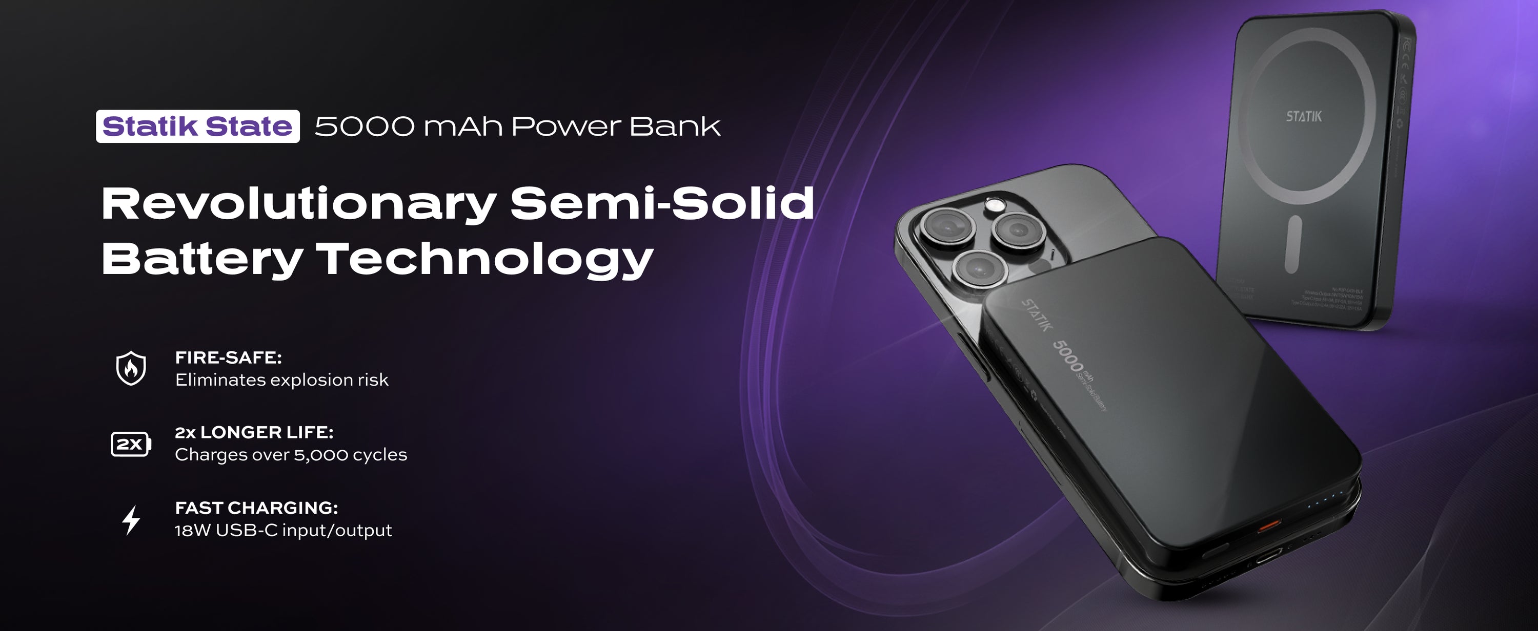 The STATIK State uses semi-solid electrolyte battery technology with 95% less liquid than a traditional lithium-ion battery. This makes it non-flammable, resistant to puncture and crush damage, and capable of lasting up to 2× more charge cycles before degrading.