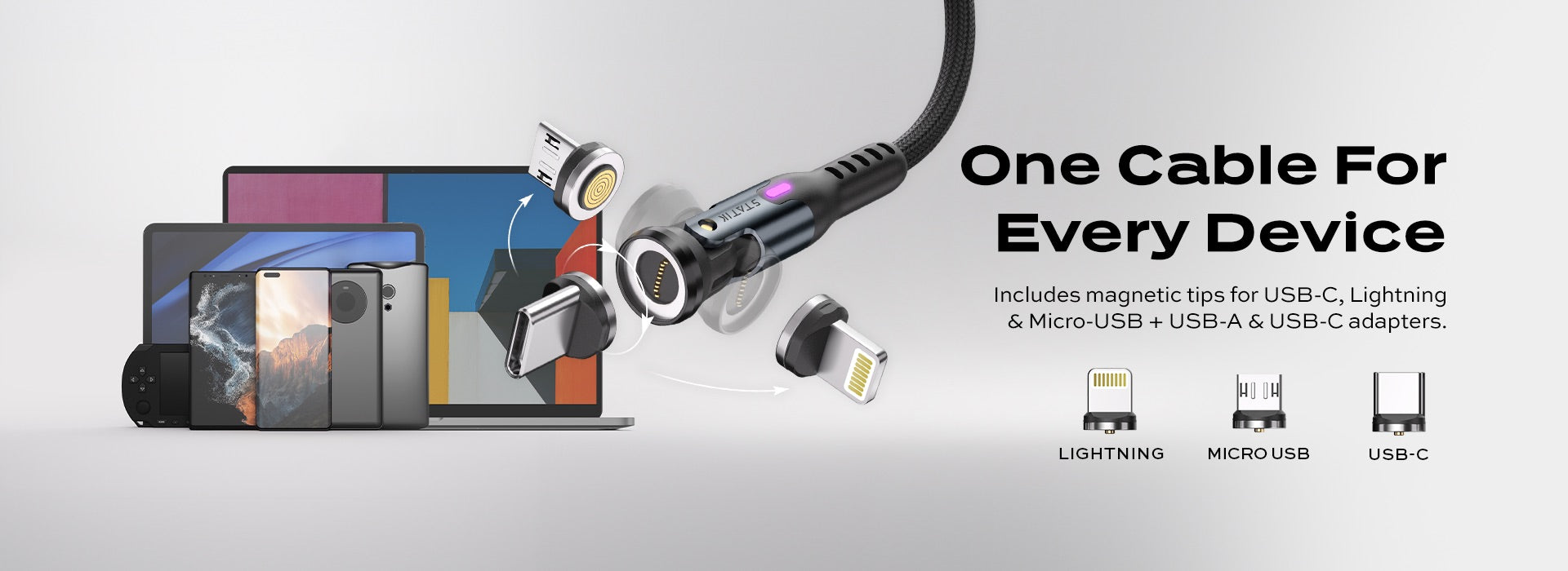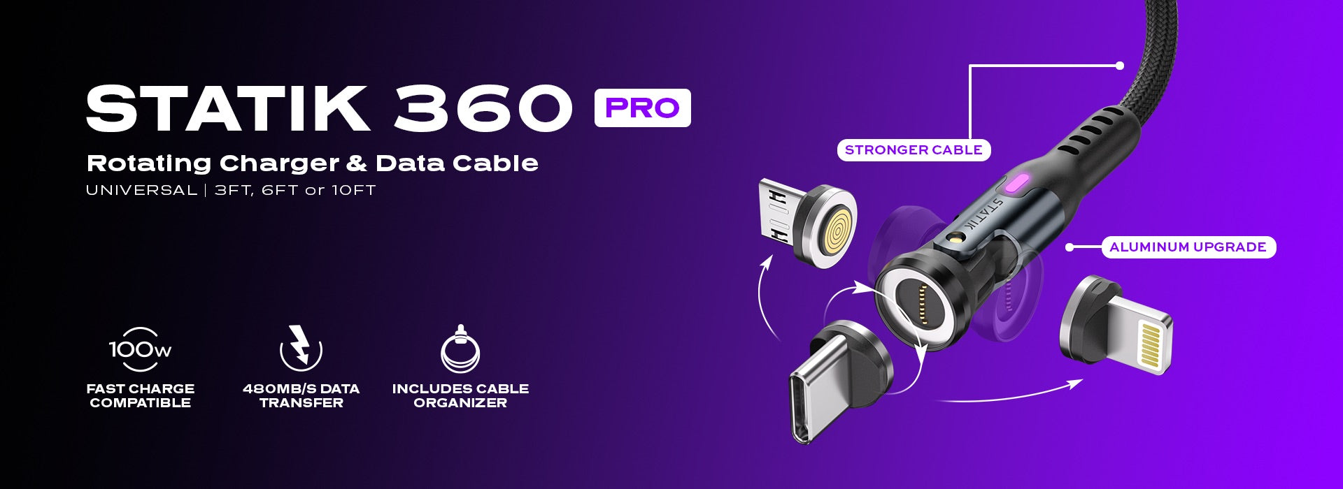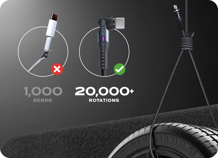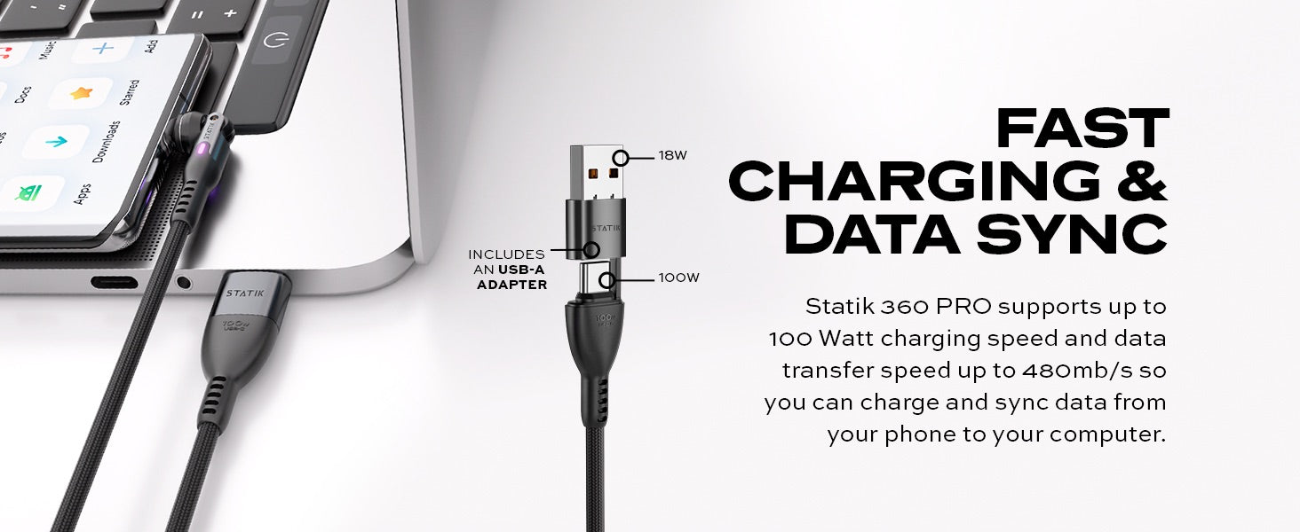 Cavo di ricarica magnetico universale Statik ® 360 Pro da 100 W con trasferimento dati - 10 volte più veloce dei cavi tradizionali!