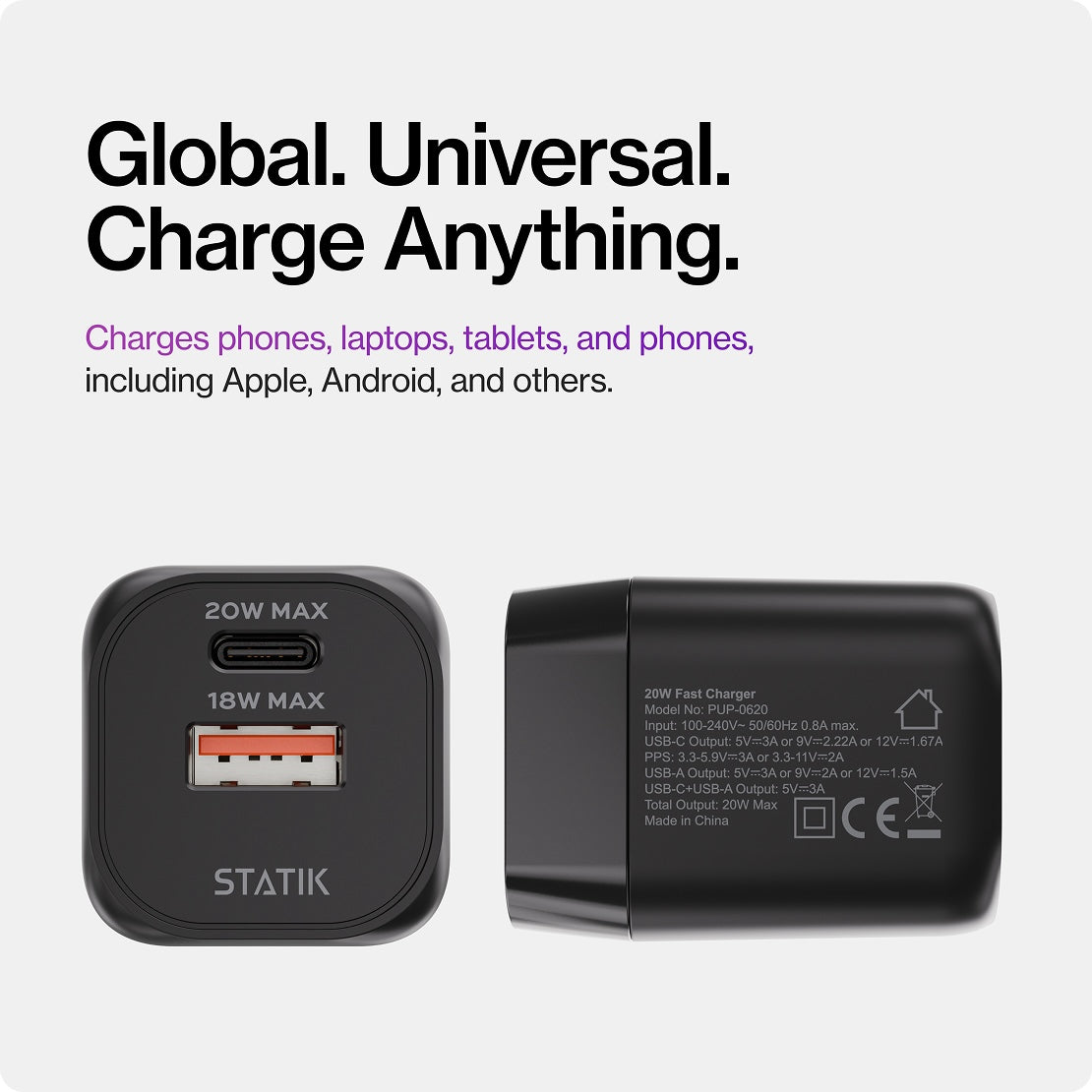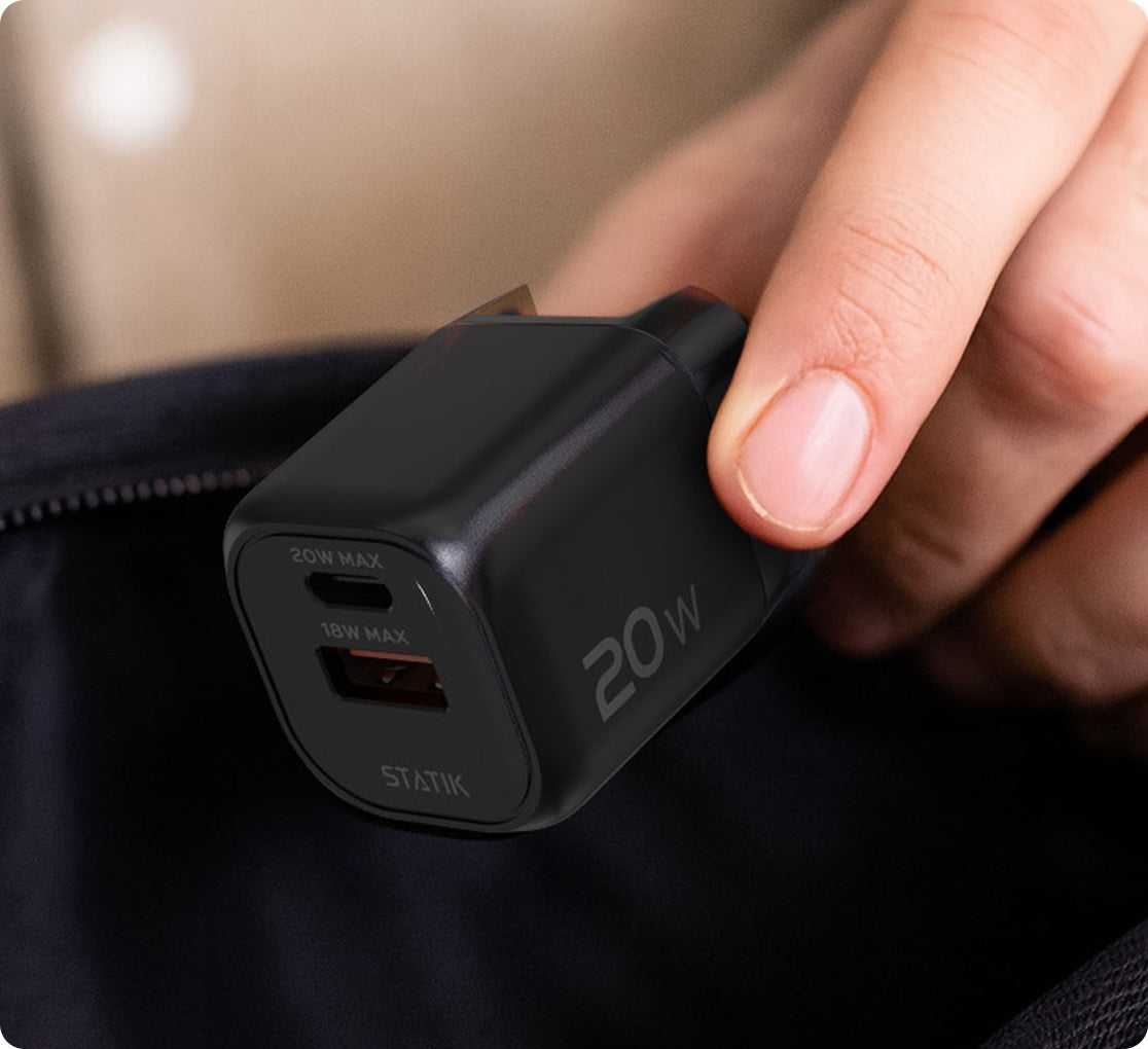 From your bedside table to your carry-on, the Statik 20W GaN Power Adapter gives you fast, efficient power with none of the bulk. With two ports (USB-C + USB-A) you can top off your phone and earbuds at once. Its GaN design stays cool, handles fluctuating voltages , and protects against overheating, overcharge, and short circuits. The foldable prongs and compact size make it perfect for travel, yet powerful enough that you won’t need a drawer full of wall adapters.