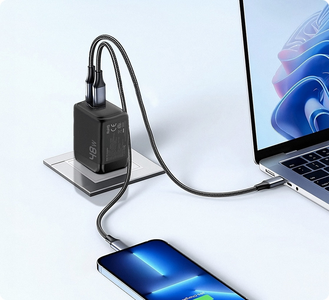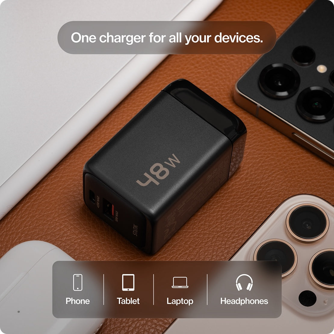 With 48W of power, this GaN charger lets you keep your laptop running while charging your phone, tablet, or earbuds at the same time. One compact adapter replaces two bulky bricks, freeing up outlets and cutting down on clutter.