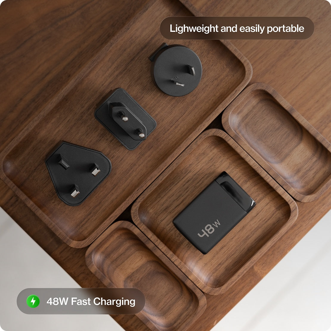 48W GaN charger with 3 International Plug Adapters (EU, UK, AU) with 1 USB-C and 1 USB-A port. Charge a laptop and phone together, up to 7Ć faster than a standard 5W charger.