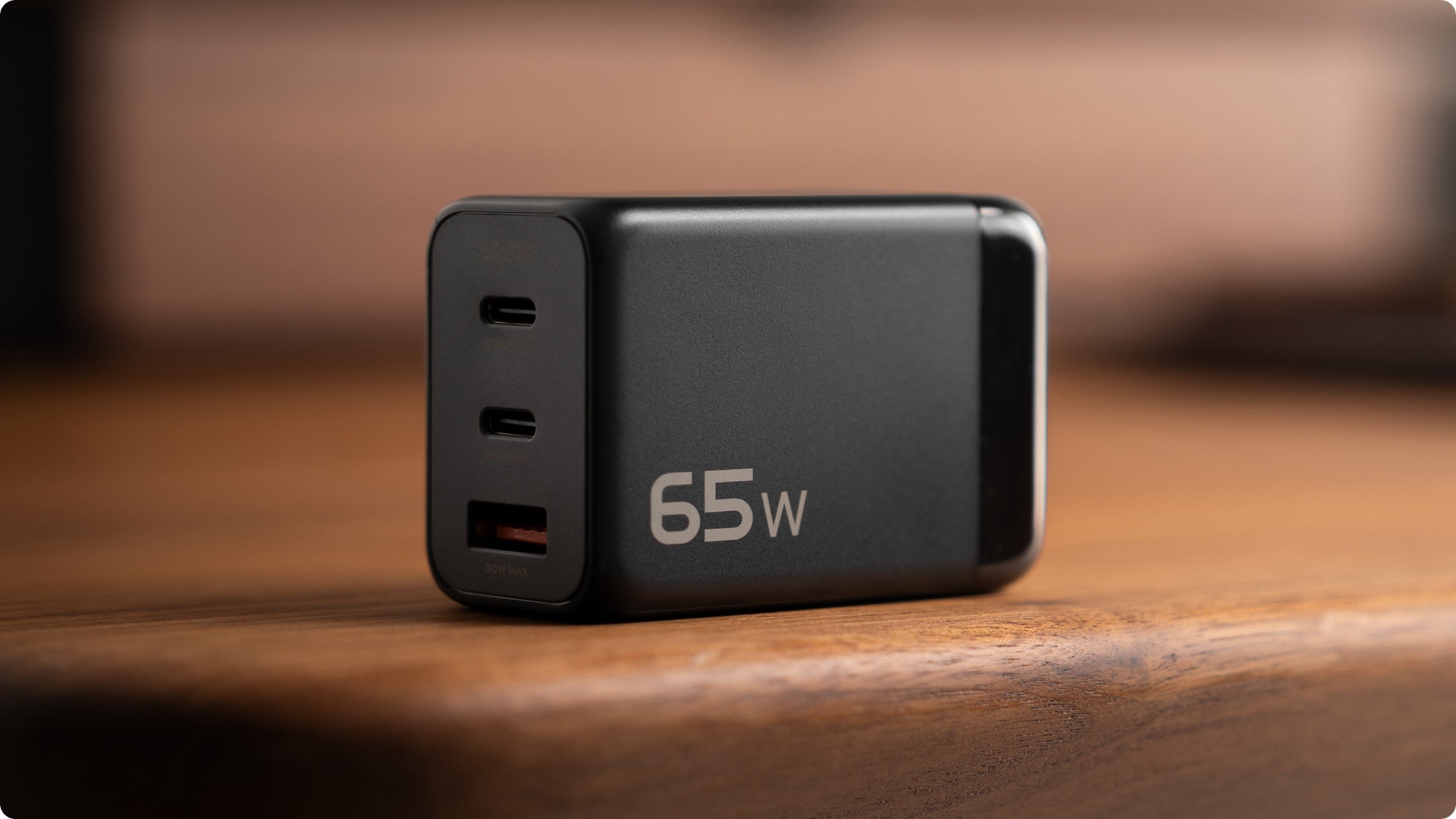65W GaN charger with 2 USB-C and 1 USB-A port. Power up three devices at once, including a MacBook Pro 13” in just 2 hours.