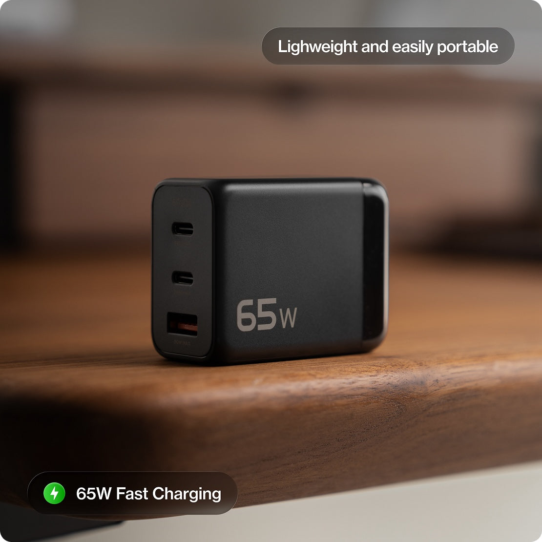 The 65W GaN Charger is built to replace multiple adapters. With two USB-C ports and one USB-A, you can power a laptop, phone, and earbuds at the same time without slowing down. One adapter, three devices, endless convenience.