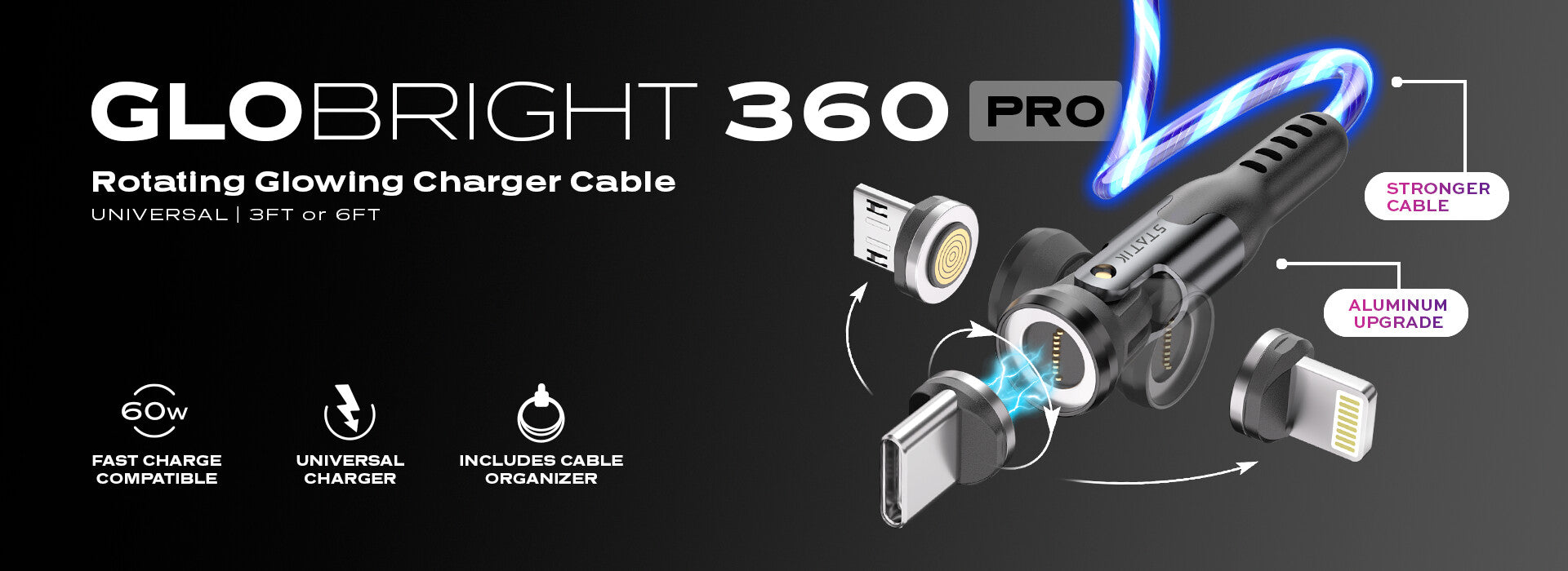 - Globally Patented LED Cable. Our all-new GloBright 360 Pro 2.0 cable comes with unrivaled technology to make charging easier, safer, and faster.
