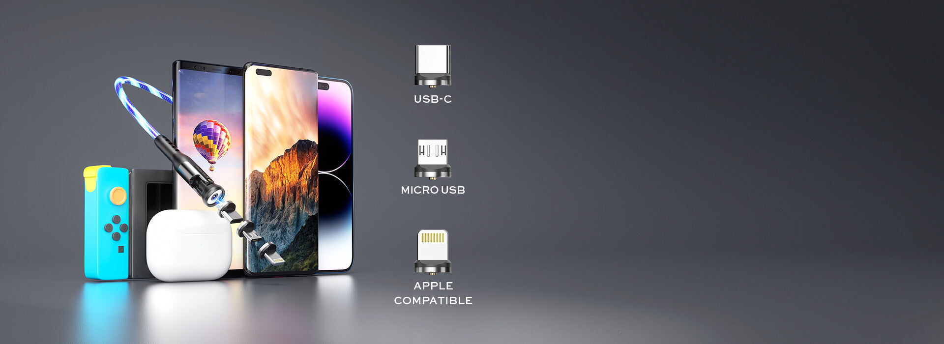 - Universal: USB-C, Apple Lightning, and Micro-USB. Charge any smartphone, laptop, tablet, drone, or other device through a secure magnetic charging tip.