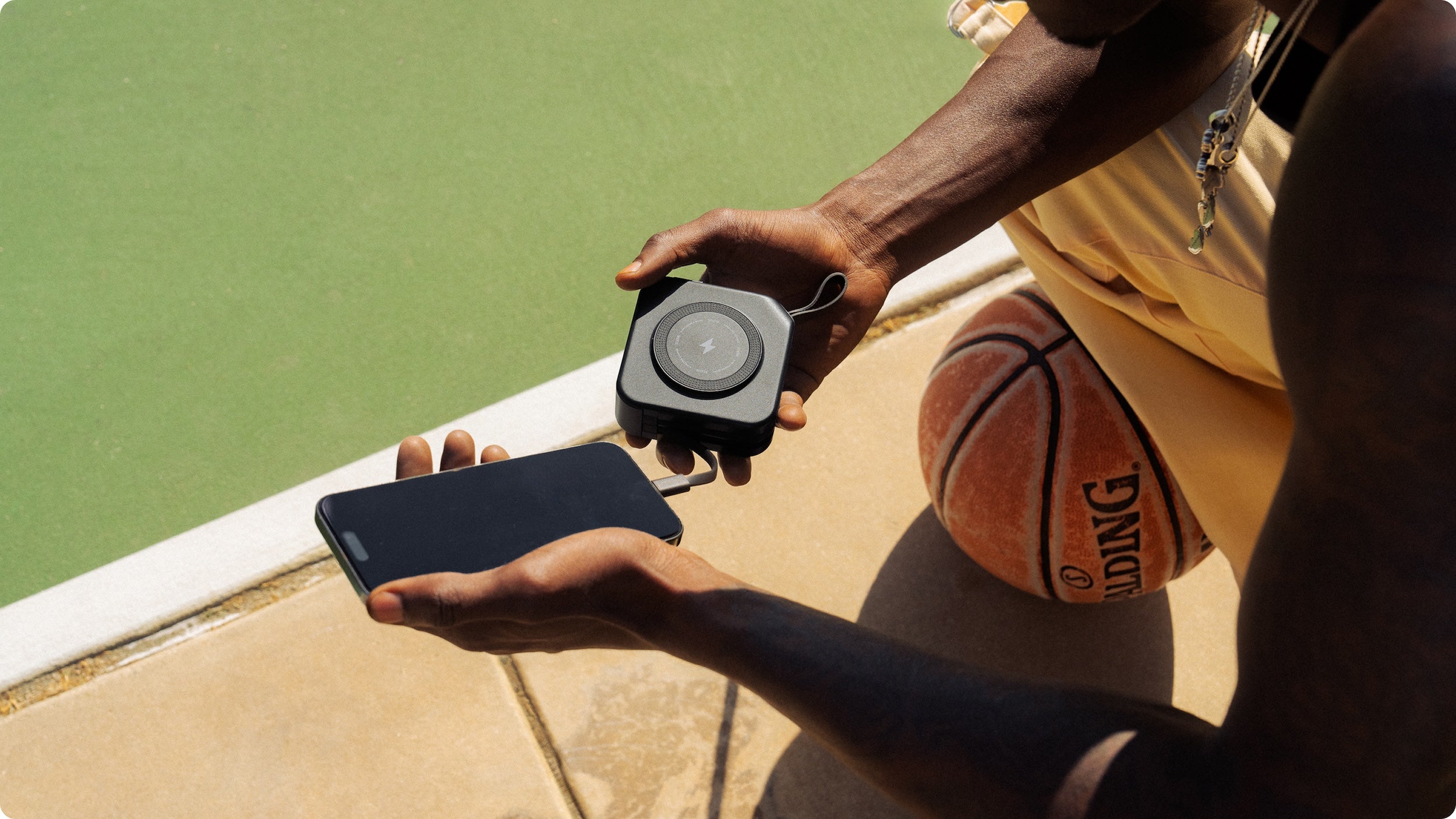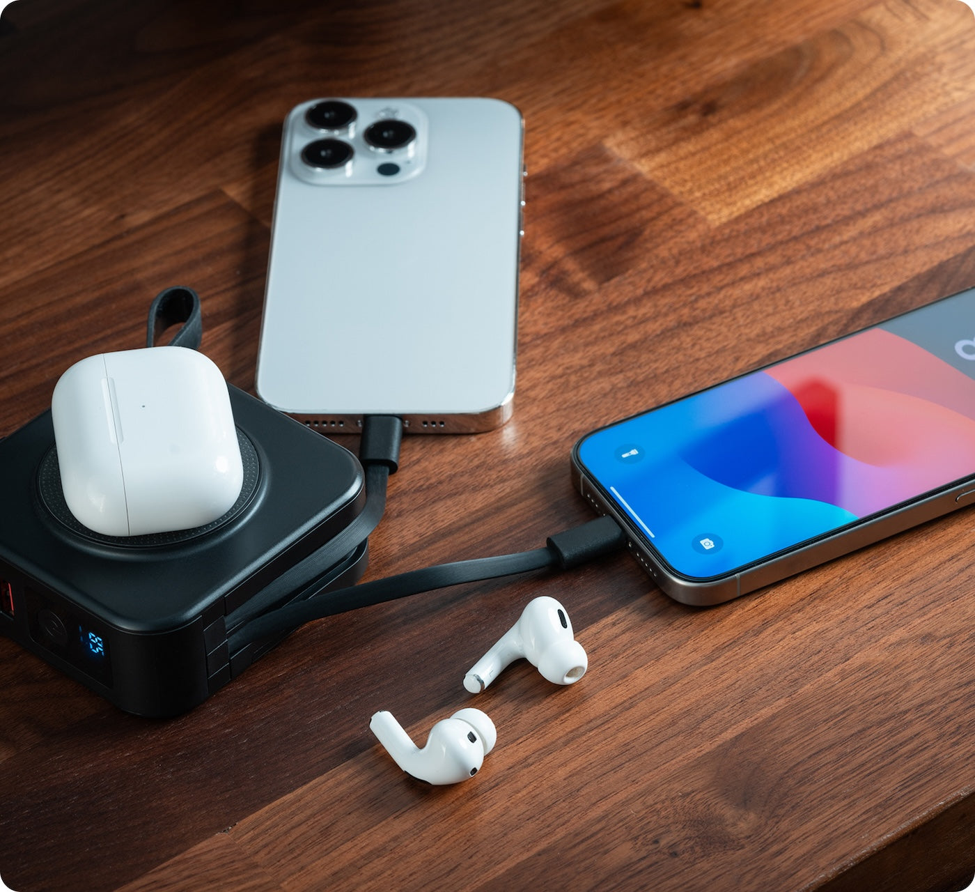 Pocket 10K power bank with built‑in cables. Charge your device from 0–50% in ~25 minutes.