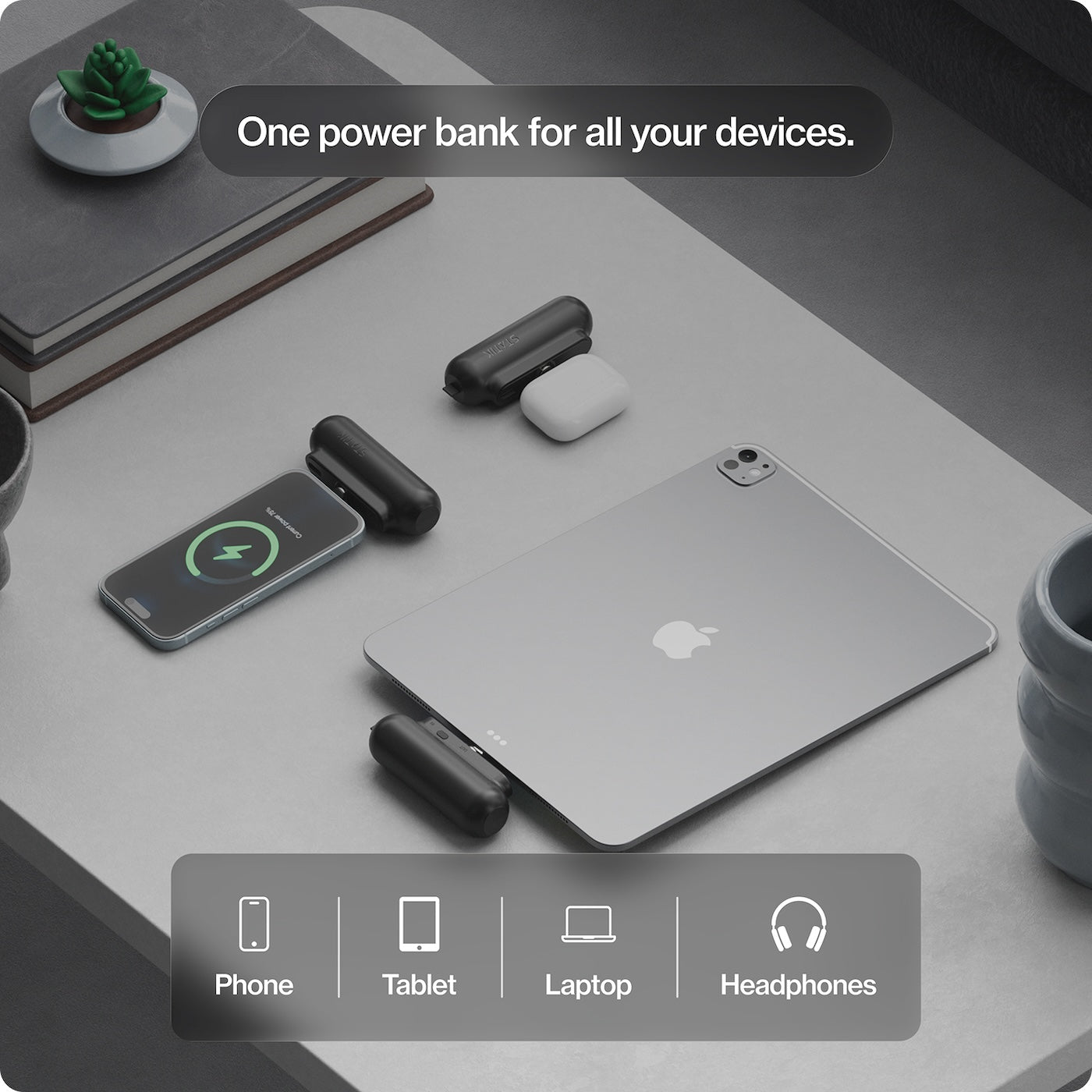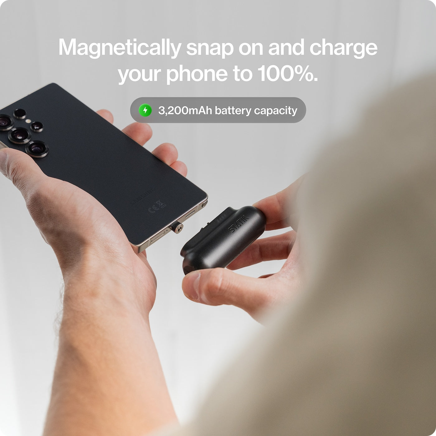 Compact 3,200 mAh magnetic power bank. Snap on to charge phones, tablets, earbuds, and more.