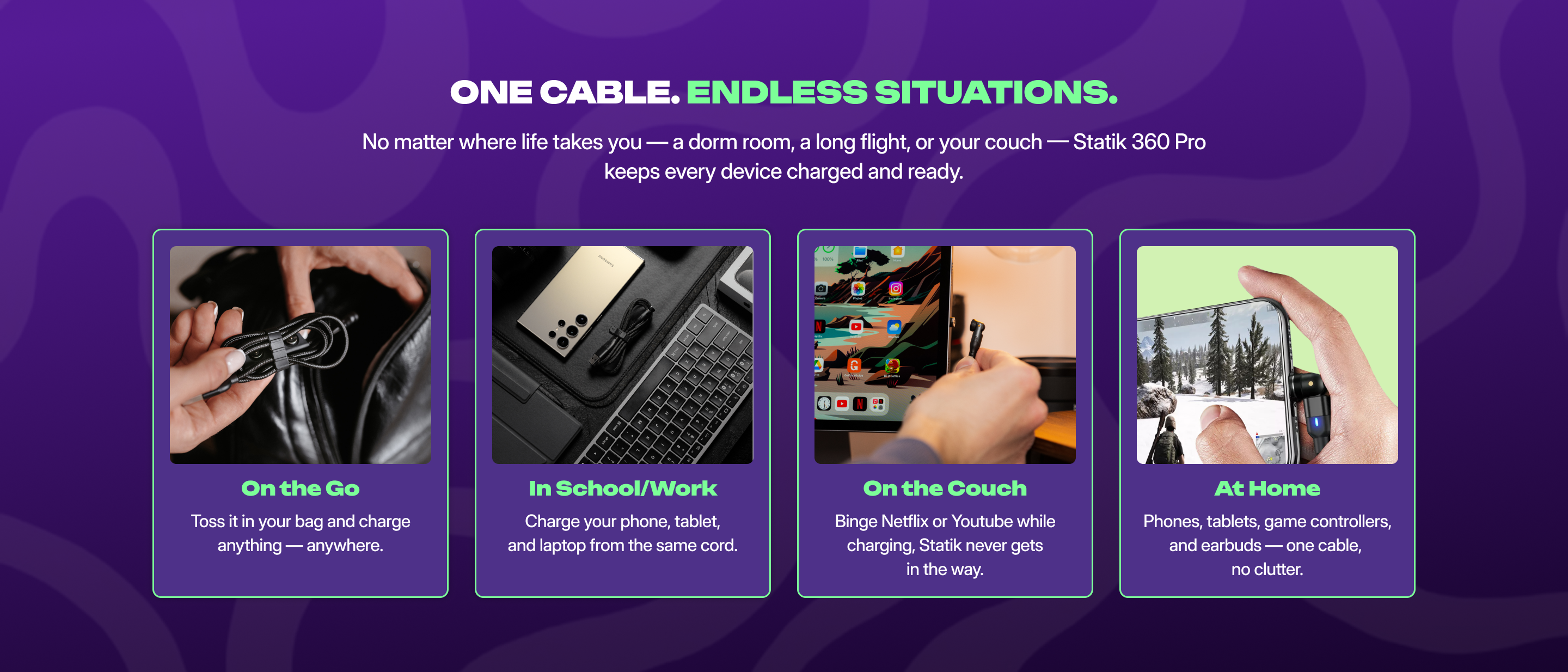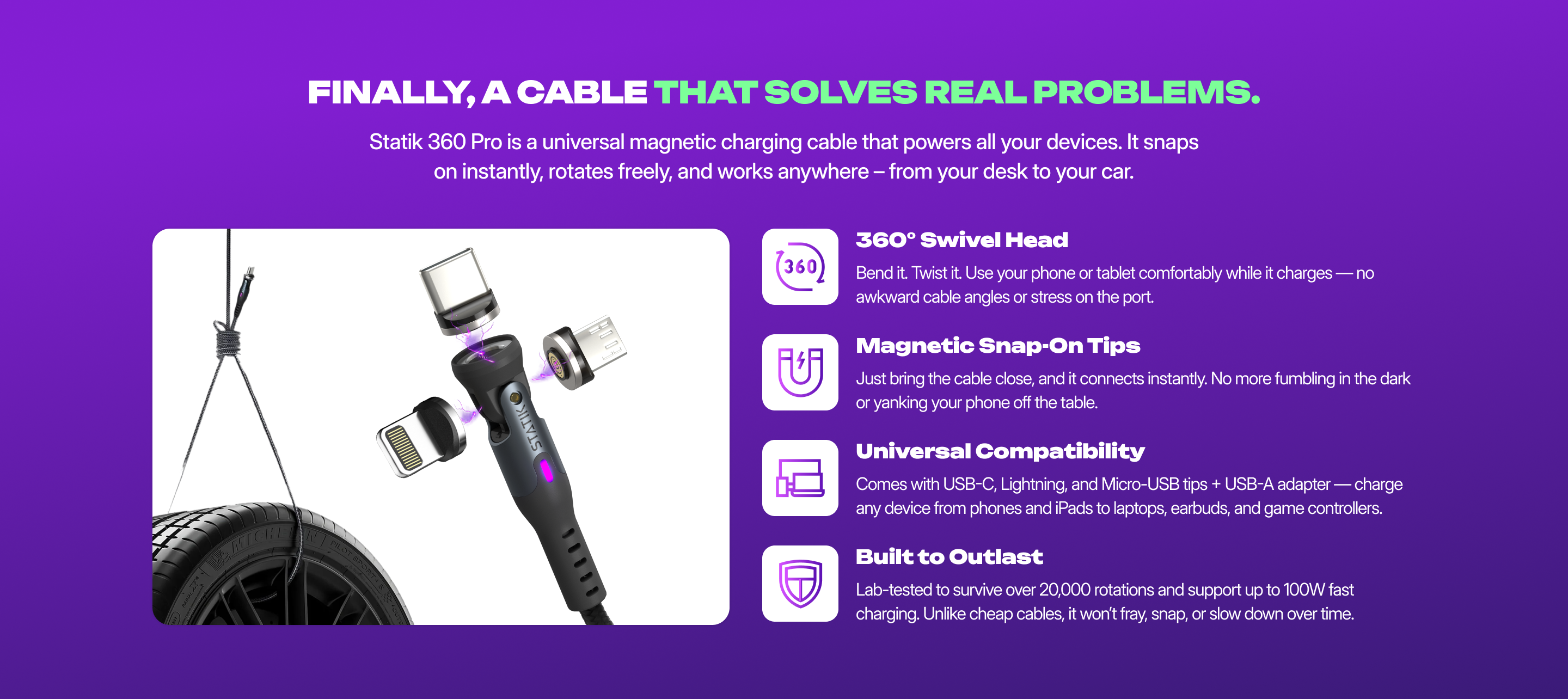 It's easy! Simply insert the USB adaptor into your device. All USB-C, Lightning, and Micro-USB devices will work with the same STATIK 360 Pro cable. The magnetic connector snaps on instantly and stays secure. When you're done, simply pull the magnetic cable off. The USB adaptor stays in the USB port for easy charging while protecting your port from lint, dirt, and moisture.