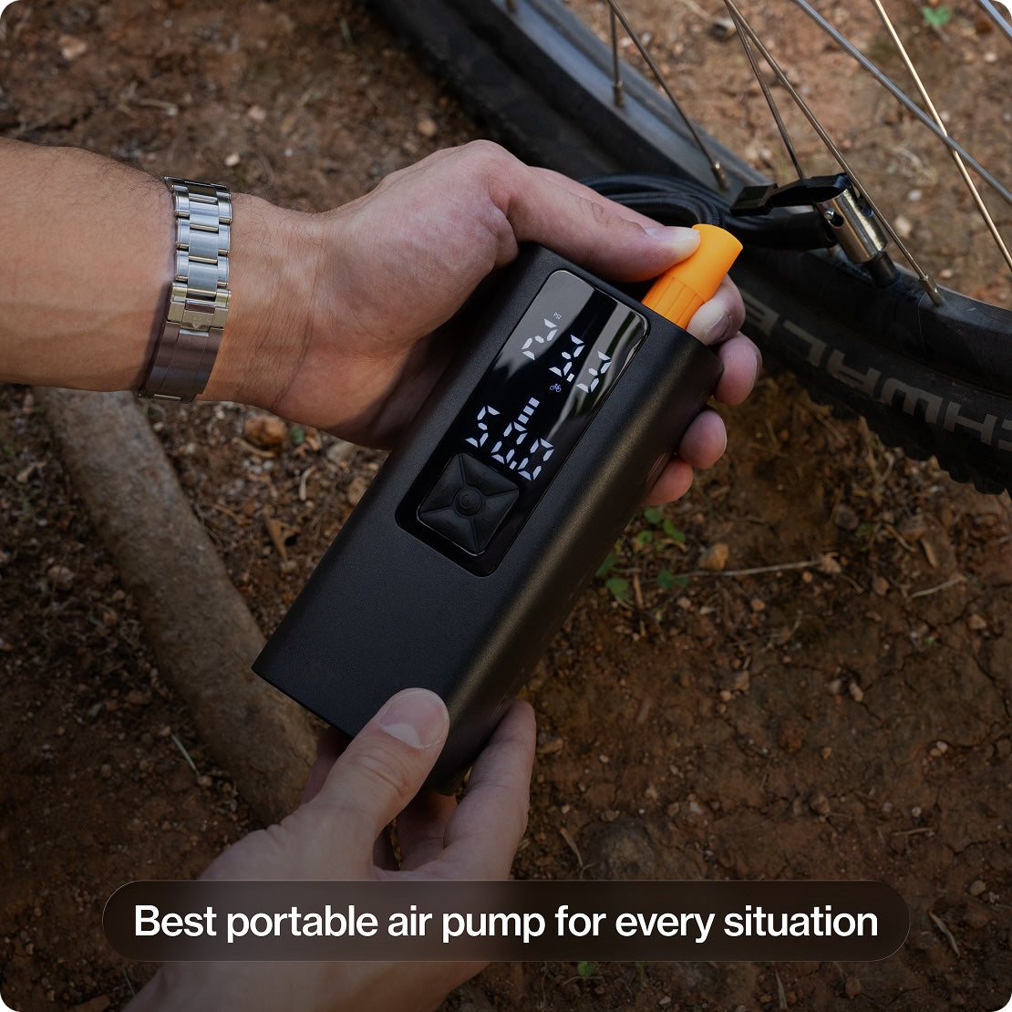 Portable rechargeable air pump with 150 PSI and built-in power bank. Inflate car tires, bikes, and more in minutes.